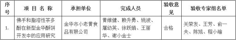 根據《金華市級科技計劃項目驗收管理辦法》(金市科字〔2015〕83號)規定,現將金華市小老黃食品有限公司承擔的《佛手和脂溶性茶多酚在新型金華酥餅開發中的應用研究》市級科技計劃項目驗收結果予以公示,接受社會監督,公示期從2018年8月21日至2018年8月28日止。任何單位和個人對驗收意見持有異議的,應當在公示期內書面向市科技局提出異議,單位應采用書面形式并加蓋公章,個人應采用實名提出異議。